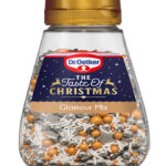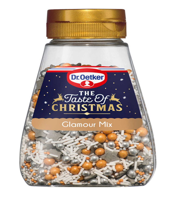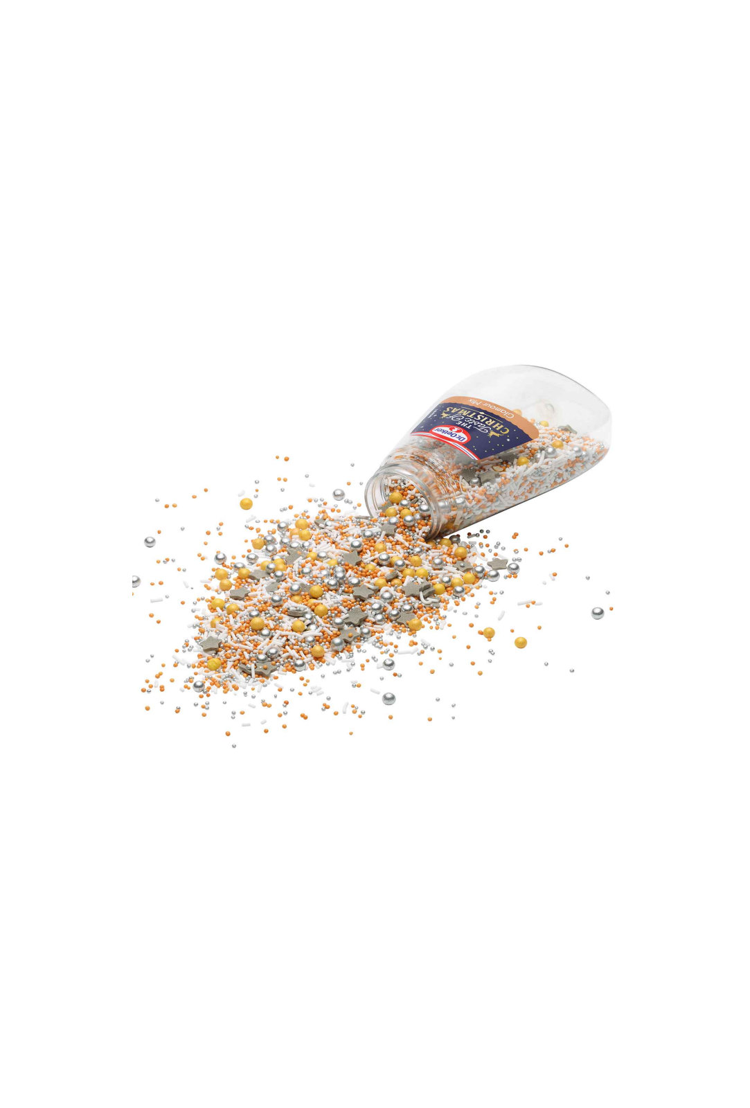 Dekor Christmas glamour mixsadrži male i velike šećerne perle u srebrnim i zlatnim bojama te bijeli šećerni posip i sive šećerne zvjezdice.