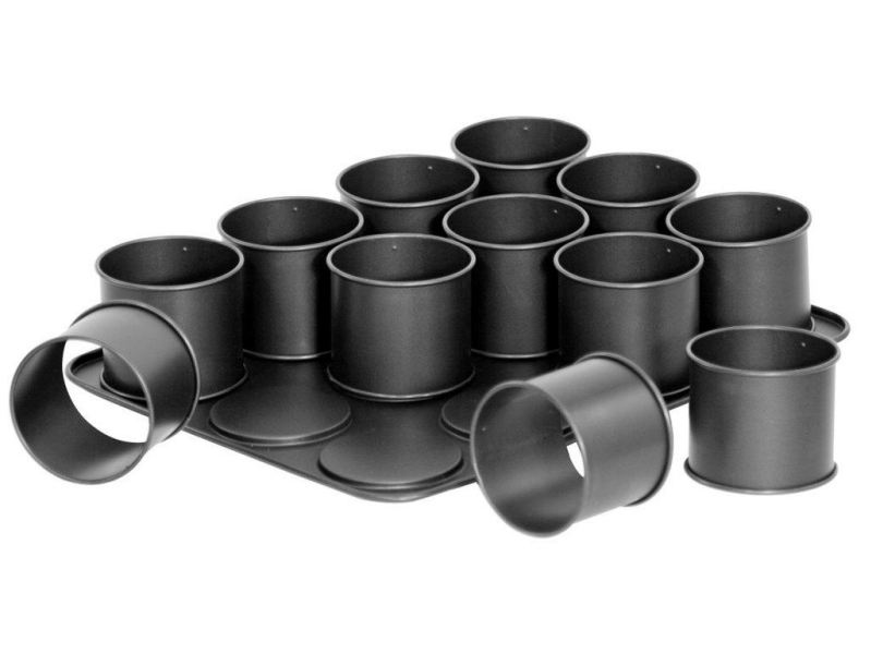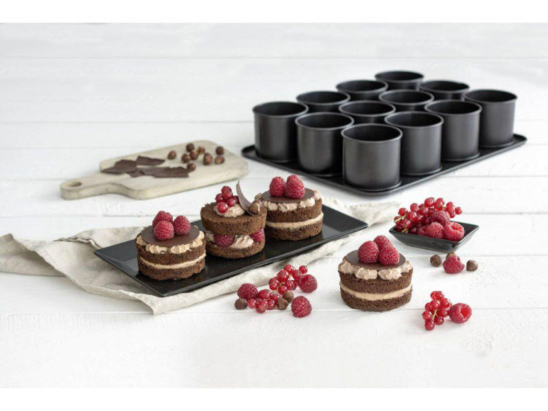 Kalup za mini torte sadrži 12 obruča , veličine Φ8,5cm, visine 7,5cm. Veličina cijelog kalupa je 38x30cm.