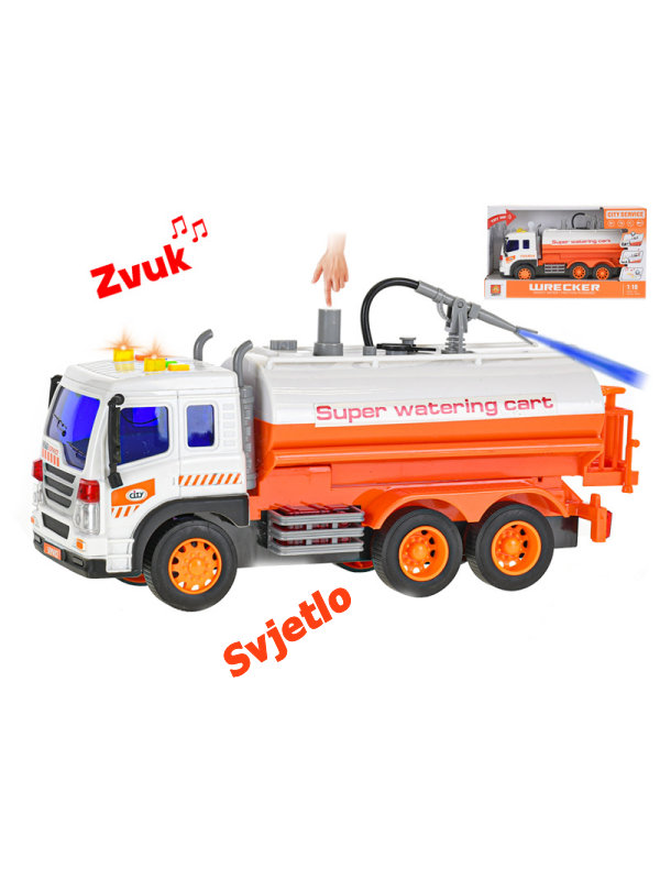 Vozilo za prijevoz vode je veličine 25 cm i dolazi u mjerilu 1:16. Vozilo sadrži cisternu u kojoj prevozi vodu. Igračka sadrži svjetlo i zvuk. Vozilo dolazi u zanimljivoj kombinaciji bijelo narančaste boje koje će oduševiti zaljubljenike u vozila.